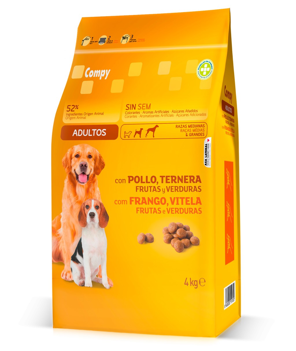 Dehidratált állati fehérjék (ebből 16% csirke, 4% marhahús), kukorica, búza, baromfizsír (9%, omega-6 zsírsavforrás), búzarost, hidrolizált állati fehérjék, cukorrépapép, borsó (1%), halolaj (0,4%, omega-3 zsírsavforrás), dehidratált sárgarépa (0,4%), dehidratált gyümölcs (0,3%) (alma, körte, mangó), ásványi anyagok, élesztősejtek (385 mg/kg).