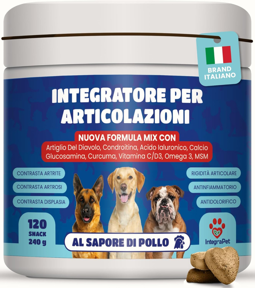 Ízületi táplálékkiegészítő kutyáknak - 120 természetes ízületápoló snack, kutyáknak való táplálékkiegészítők glükózaminnal, kondroitinnal, ördögcsáppal, kollagénnel és hialuronsavval - olasz márka